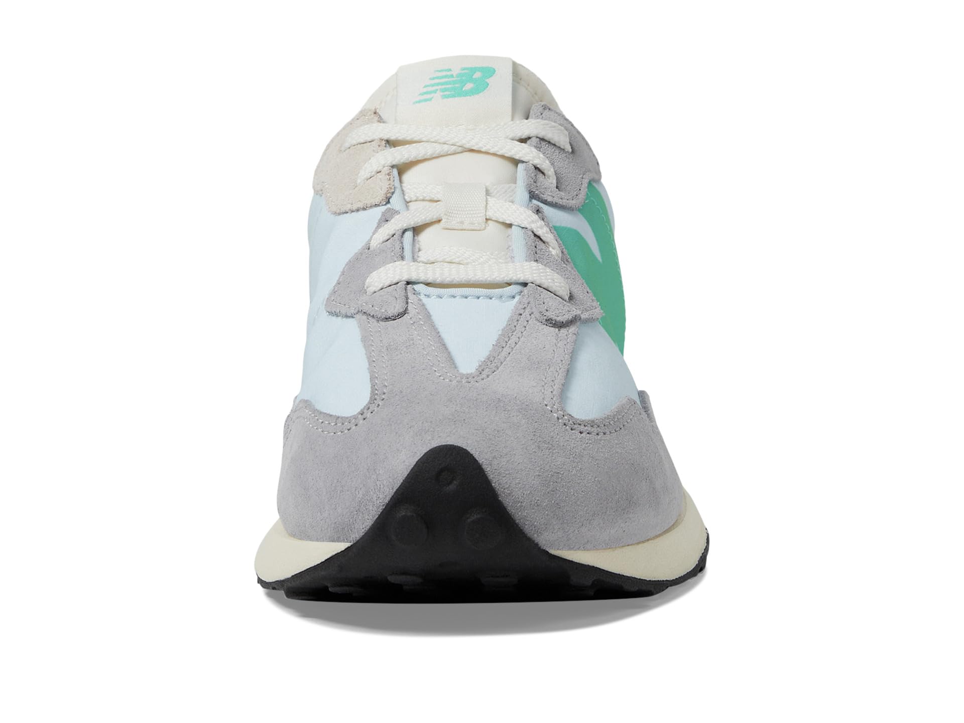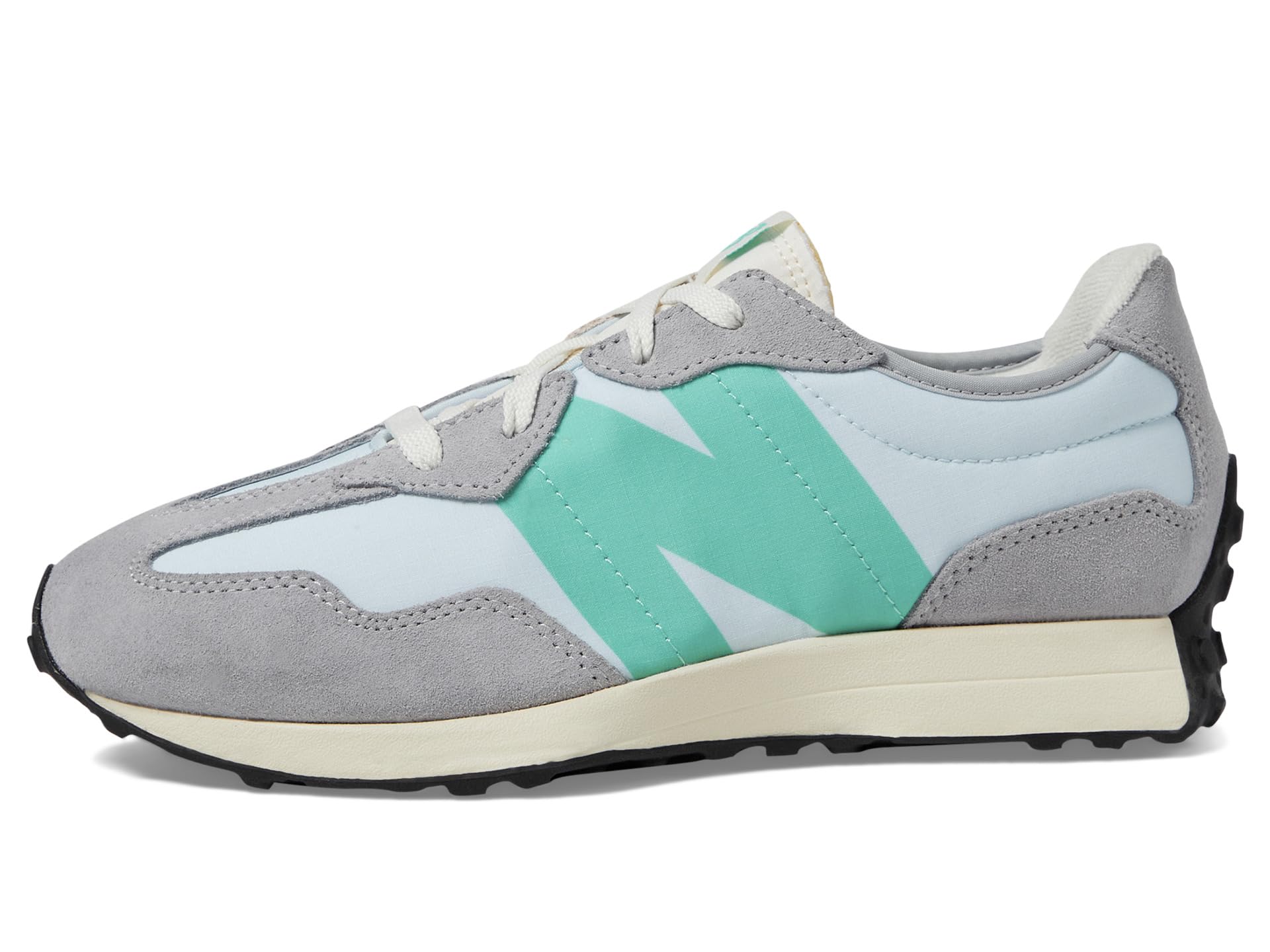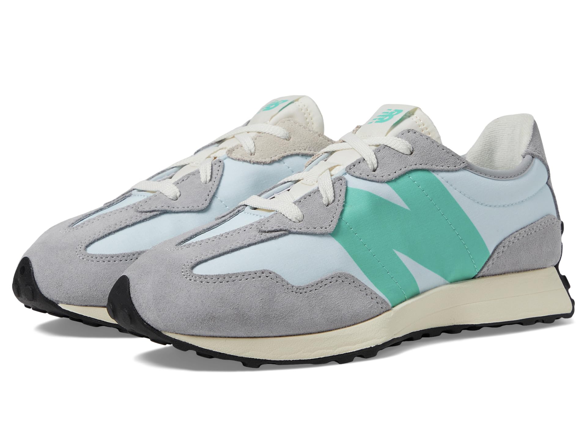 - The New Balance® Kids 327 Sneakers sheds new light on the ’70s as a time of innovation by boldly reshaping classic design elements with a thoroughly contemporary outlook. With an angular reworking of the tried-and-true wedge silhouette, outsize, asymmetrically applied oversized’N’ branding, split eyerow, flared midsole, and round toe silhouette, the 327 provides nothing less than a complete reimagination of our running heritage. The sneakers feature a suede upper with color-clock details & a lace-up closure.