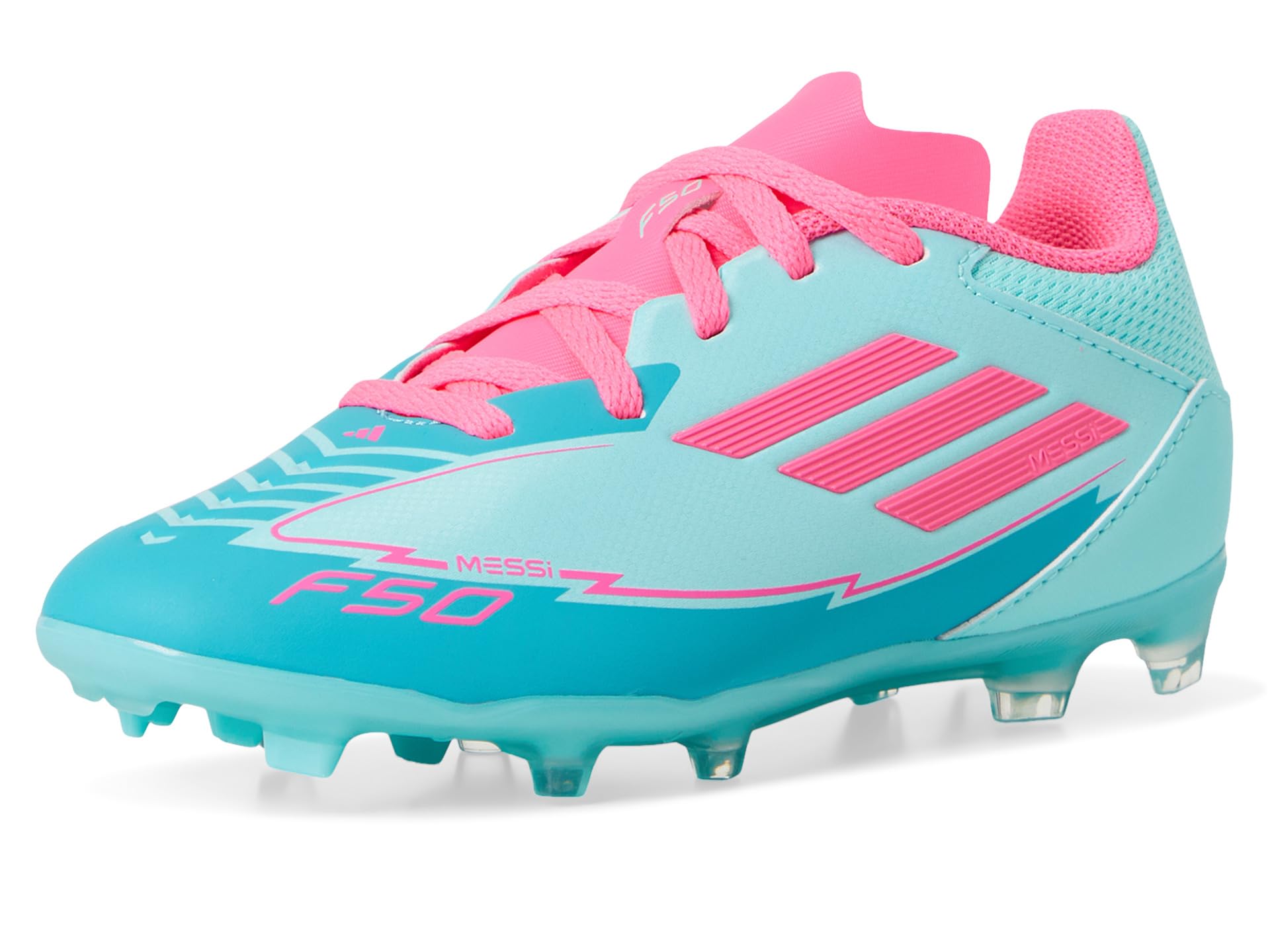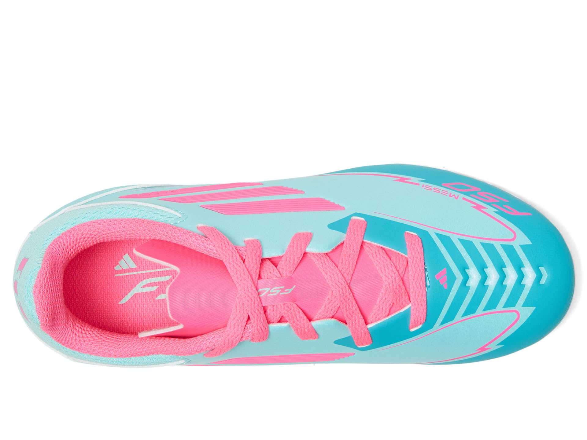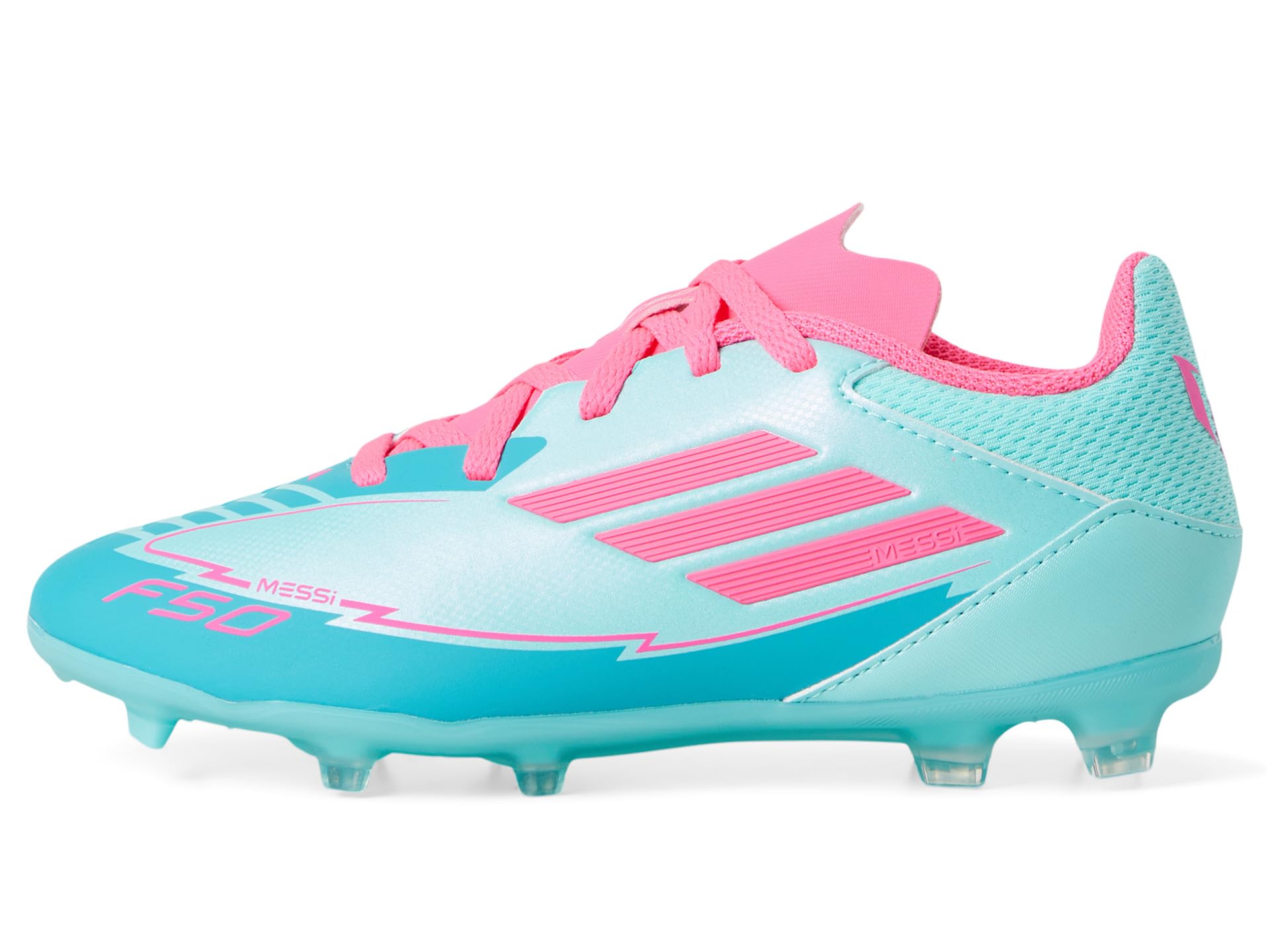 - Get your little soccer star ready to score big choosing the adidas® Kids F50 League Messi Soccer Cleats! These cleats feature lightweight rubber upper and synthetic rubber lining for ultimate comfort and durability on the field. The rubber insole provides extra cushioning, while the lace-up closure ensures a secure fit. With a regular fit and low-top design, these cleats are perfect for budding athletes who want to play like their hero, Messi.