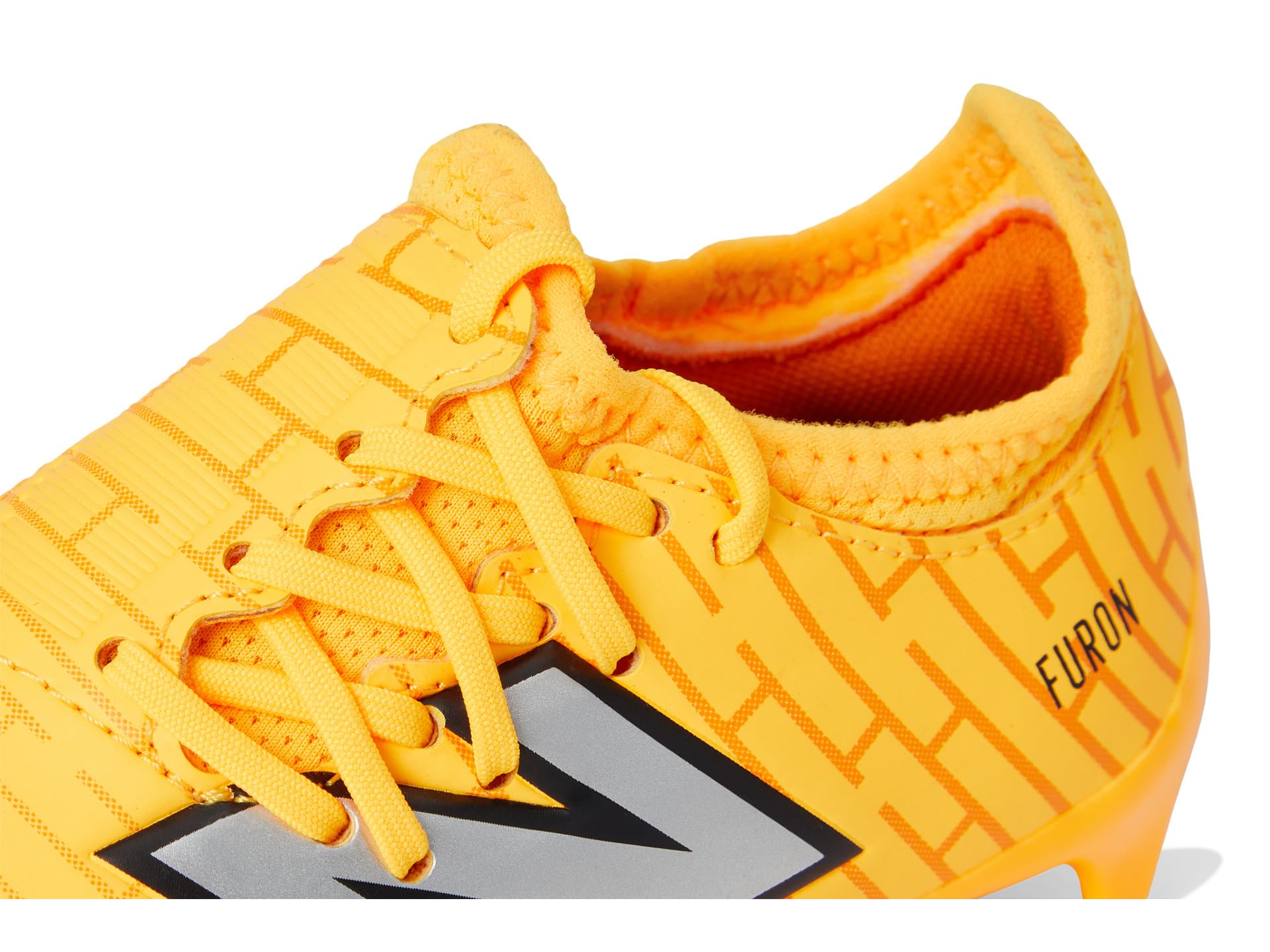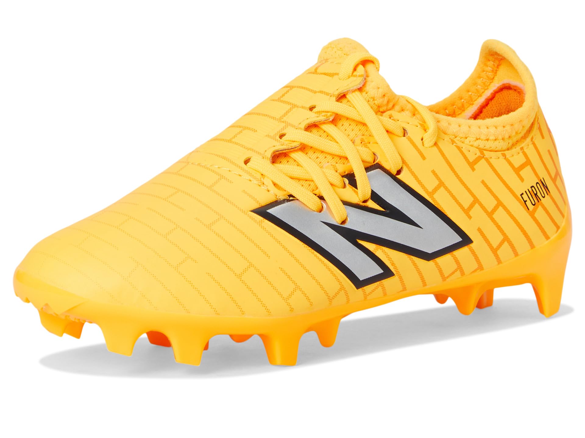 - The New Balance® Kids Furon Dispatch FG V7+ soccer cleats are a perfect choice for young athletes looking to up their game on the field. These cleats feature lightweight rubber upper with a knit collar for a comfortable fit, as well as natural rubber lining and insole for added durability. The off-set asymmetrical lacing with canopy design provides an increased strike zone, giving your child an edge in every game. Plus, the Flying NB and heel graphic details add a touch of style to these performance-driven cleats.