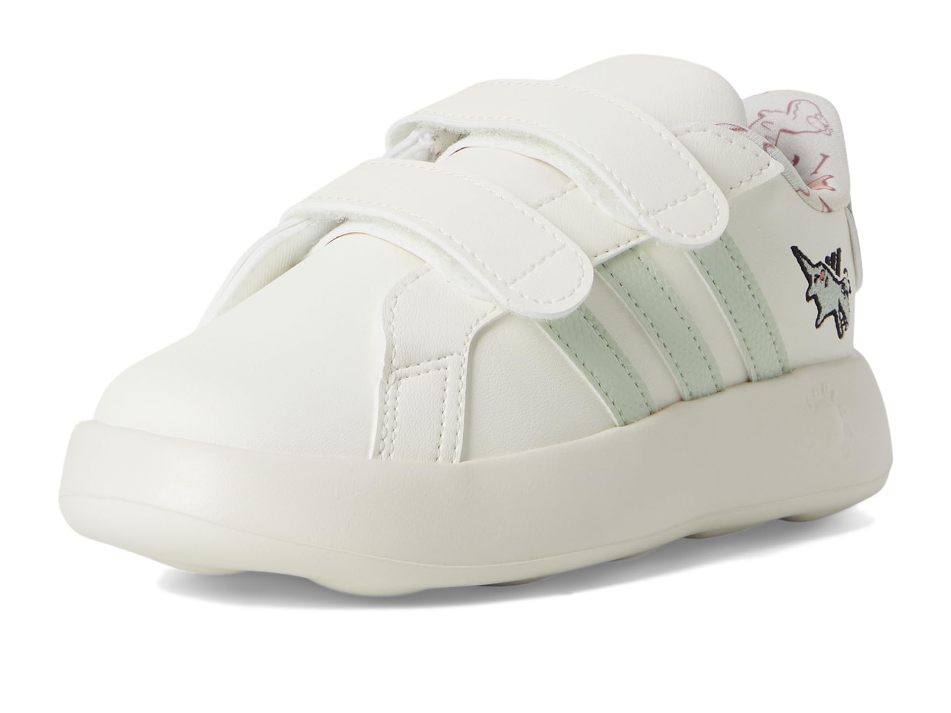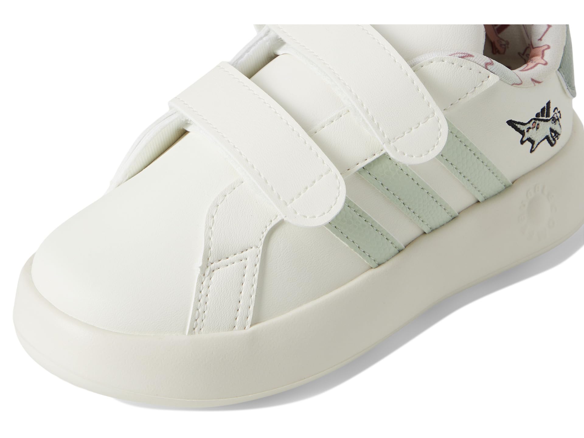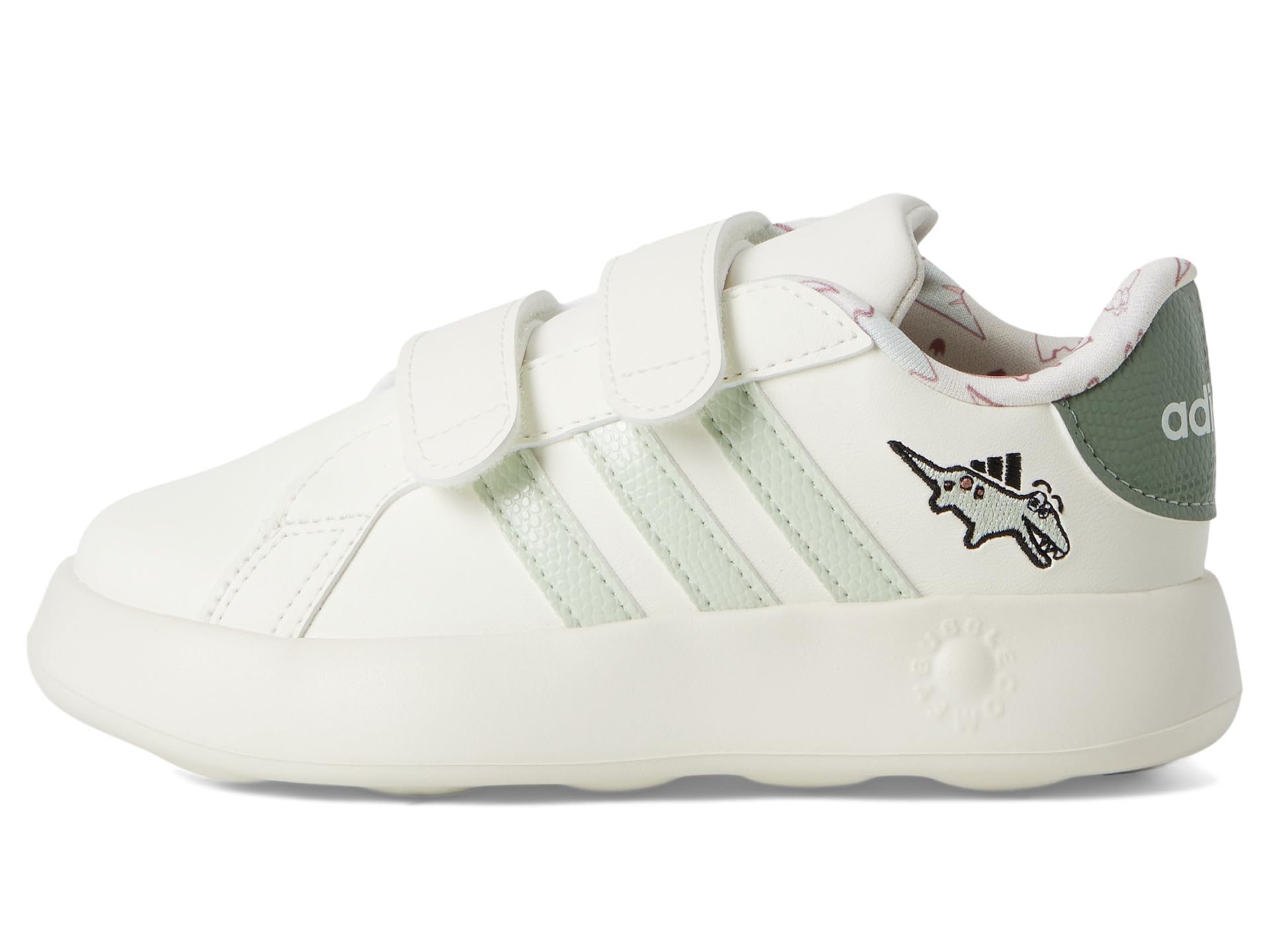 - From first steps to cruising around, they’ll love the comfort the adidas® Kids Grand Court Dino Sportswear Shoes brings to their playground style! The hook-and-loop straps make slipping these on a cinch, while the bubbly synthetic rubber outsole keeps little growing feet happy.
