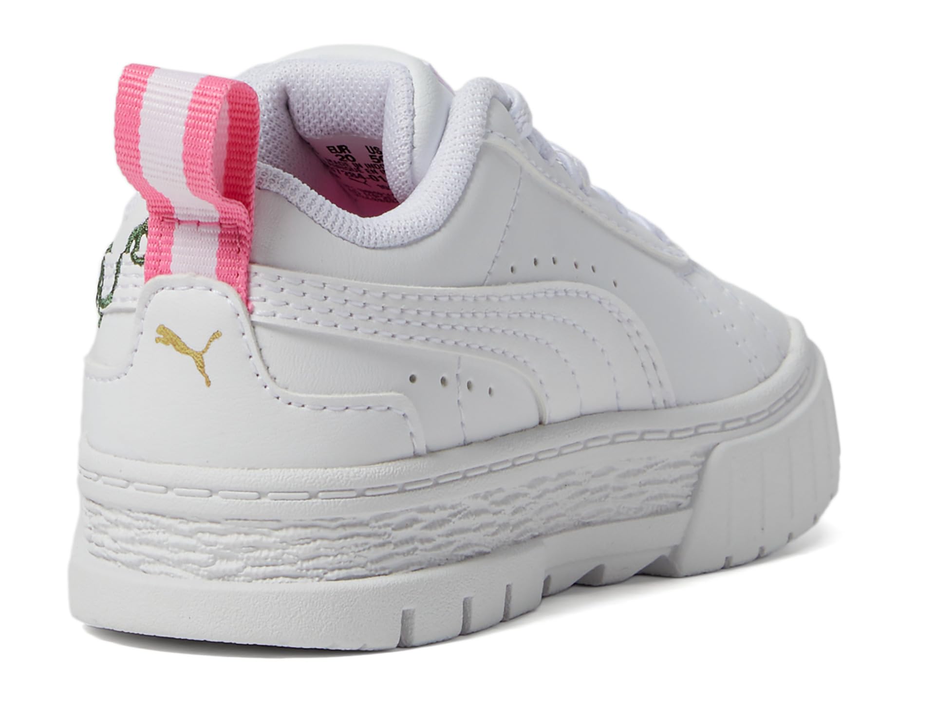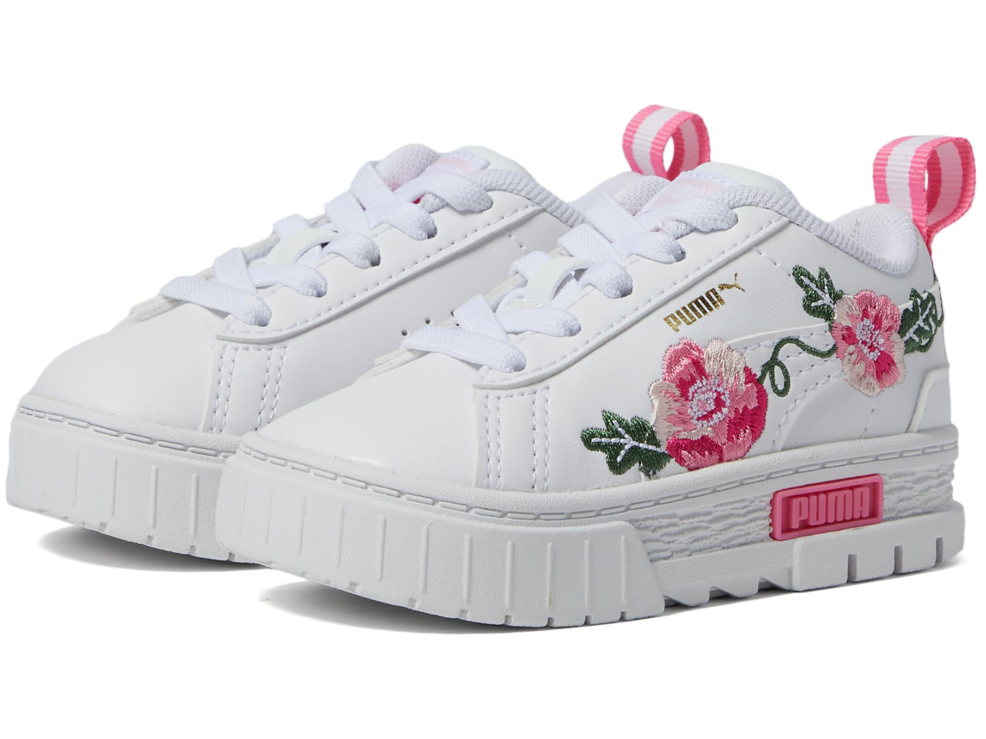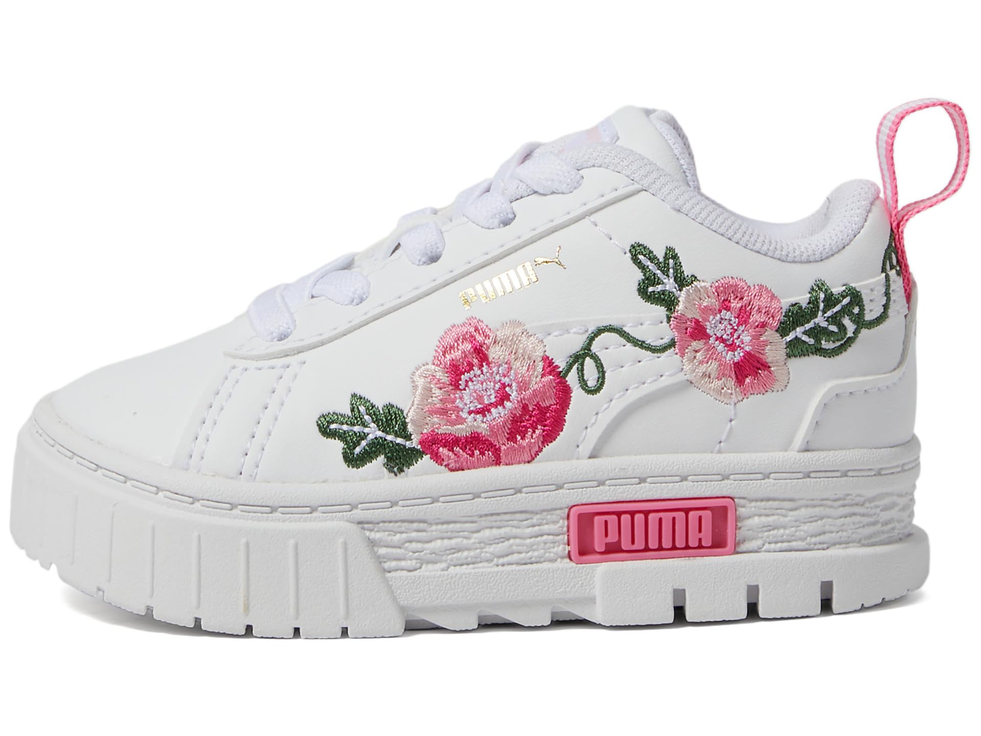 - Let your baby feel the comfort and luxury of the PUMA® Kids Mayzethis Sneakers, featuring a stand-out silhouette that takes design inspiration straight from the streets. The low-top sneakers come with a stacked outsole with contrasting rubber tooling for an edgy, layered look. This execution also features a leather upper with a synthetic formstrip and elevated embroidered floral details. Plus, a polyester lining and rubber insole for lasting comfort. The lace-up closure ensures a snug fit and the ankle pull tab allows easy donning/doffing.