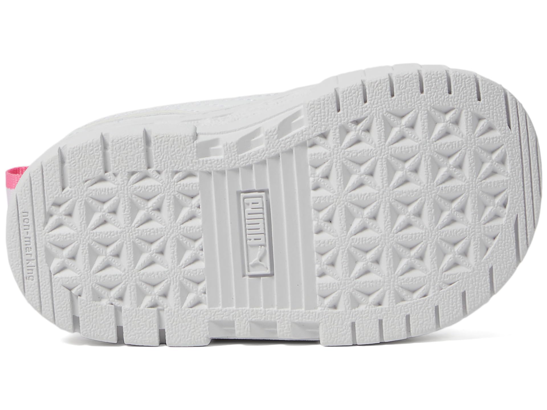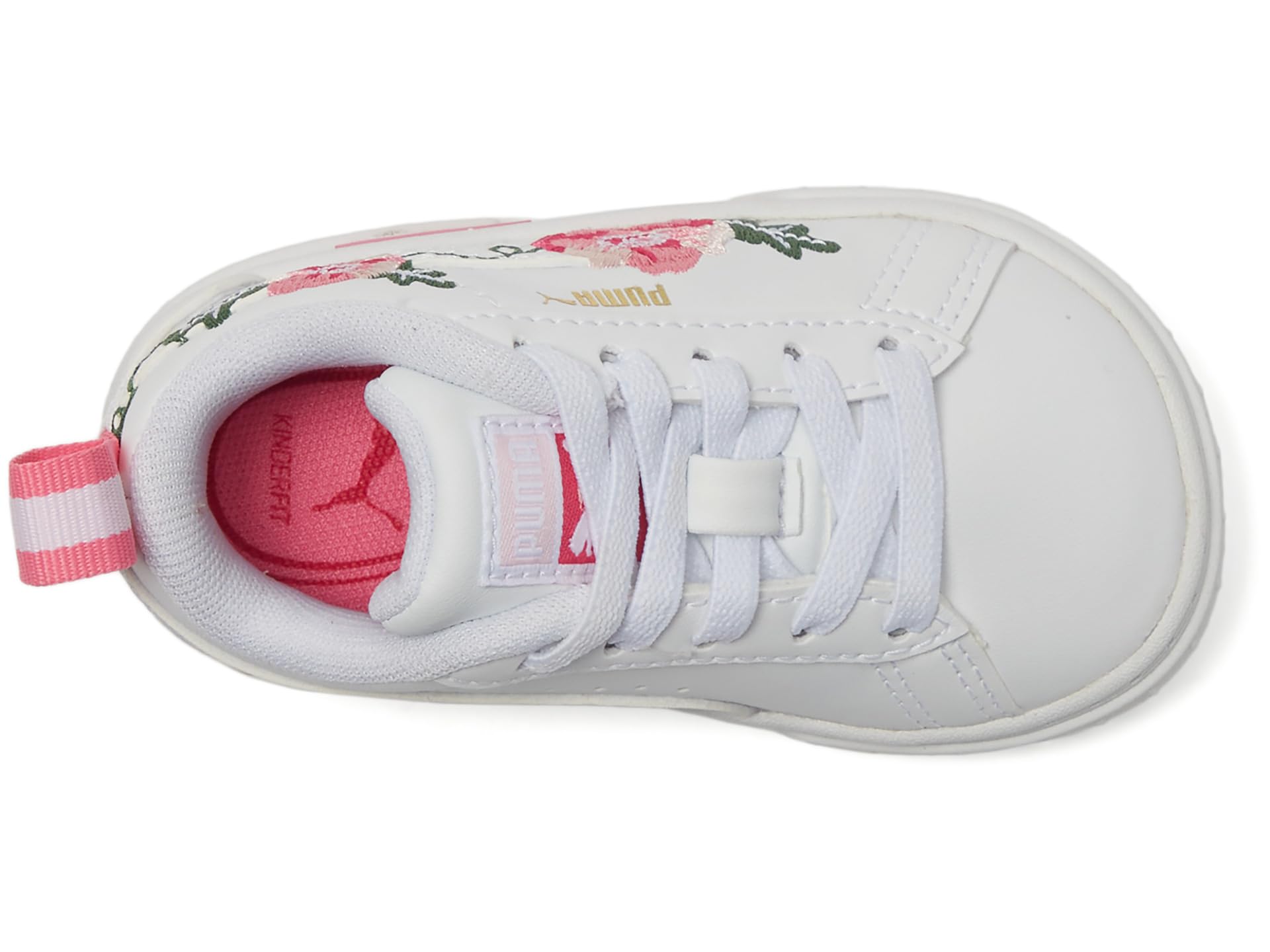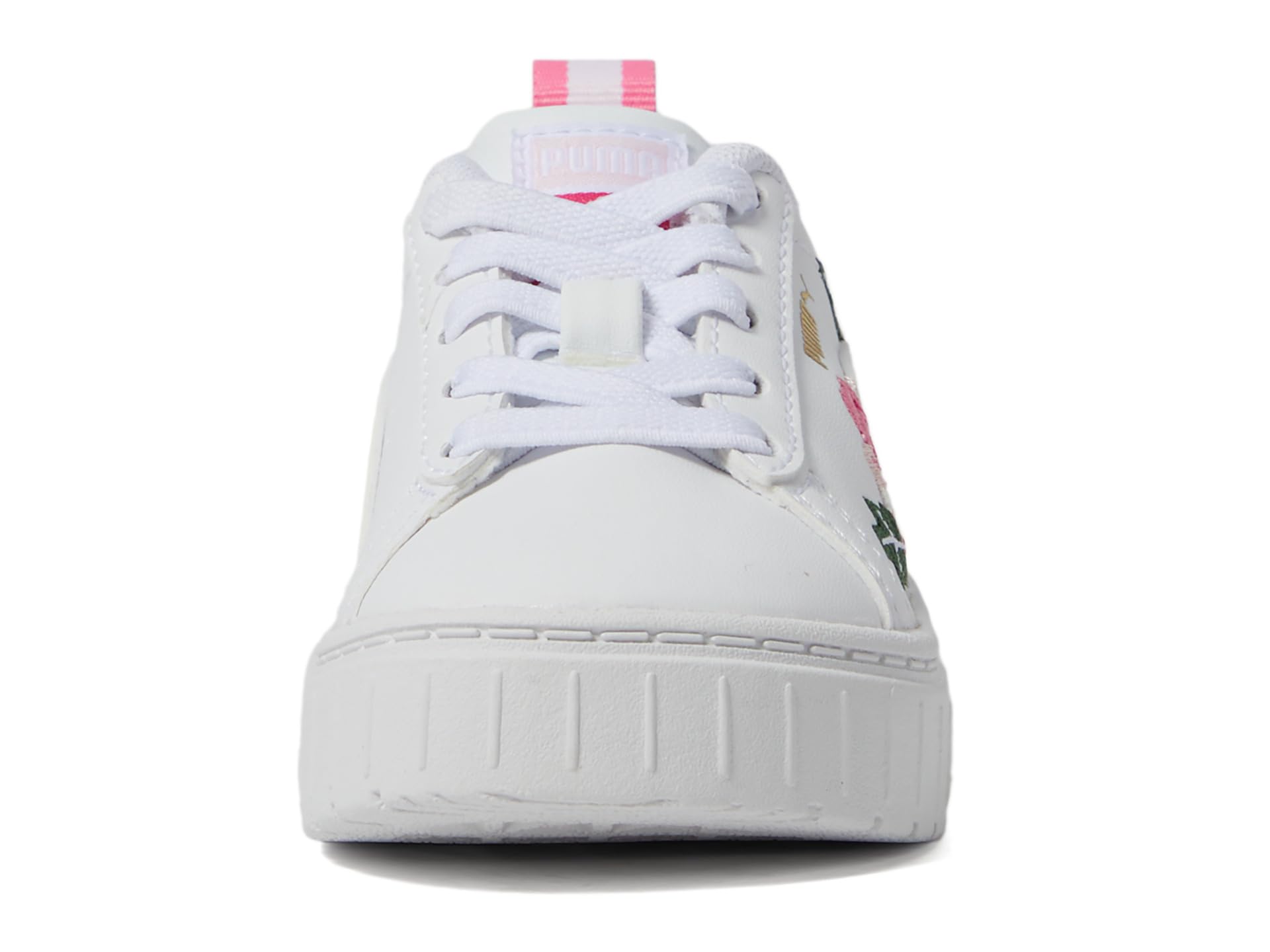- Let your baby feel the comfort and luxury of the PUMA® Kids Mayzethis Sneakers, featuring a stand-out silhouette that takes design inspiration straight from the streets. The low-top sneakers come with a stacked outsole with contrasting rubber tooling for an edgy, layered look. This execution also features a leather upper with a synthetic formstrip and elevated embroidered floral details. Plus, a polyester lining and rubber insole for lasting comfort. The lace-up closure ensures a snug fit and the ankle pull tab allows easy donning/doffing.
