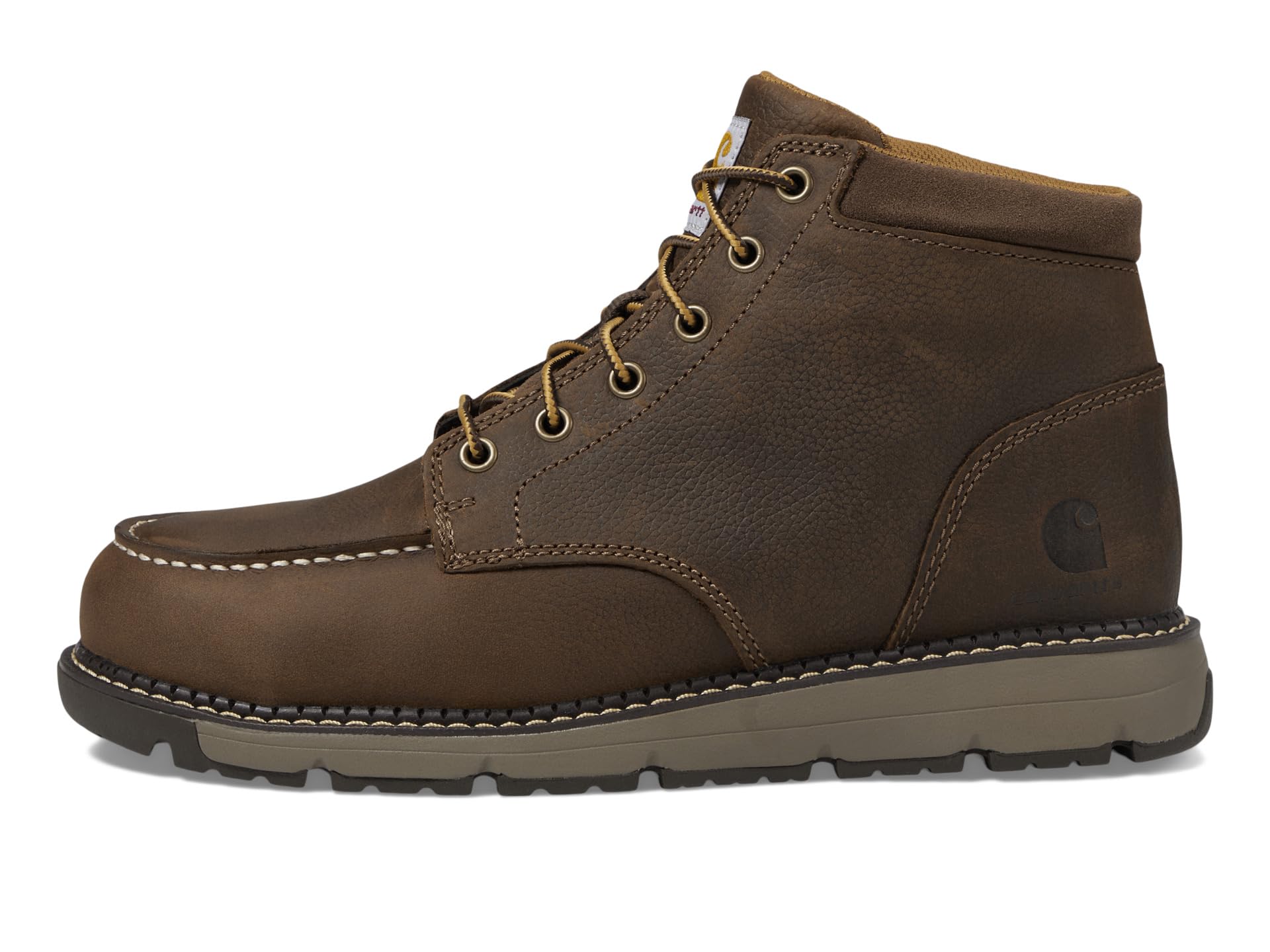 - Experience lasting comfort and durability during the busy workday in the Carhartt® Millbrook Steel Toe Moc Wedge Boot. Featuring a lace-up closure in a moc toe silhouette with a padded tongue and collar for added support and branding on the tongue and heel counter.