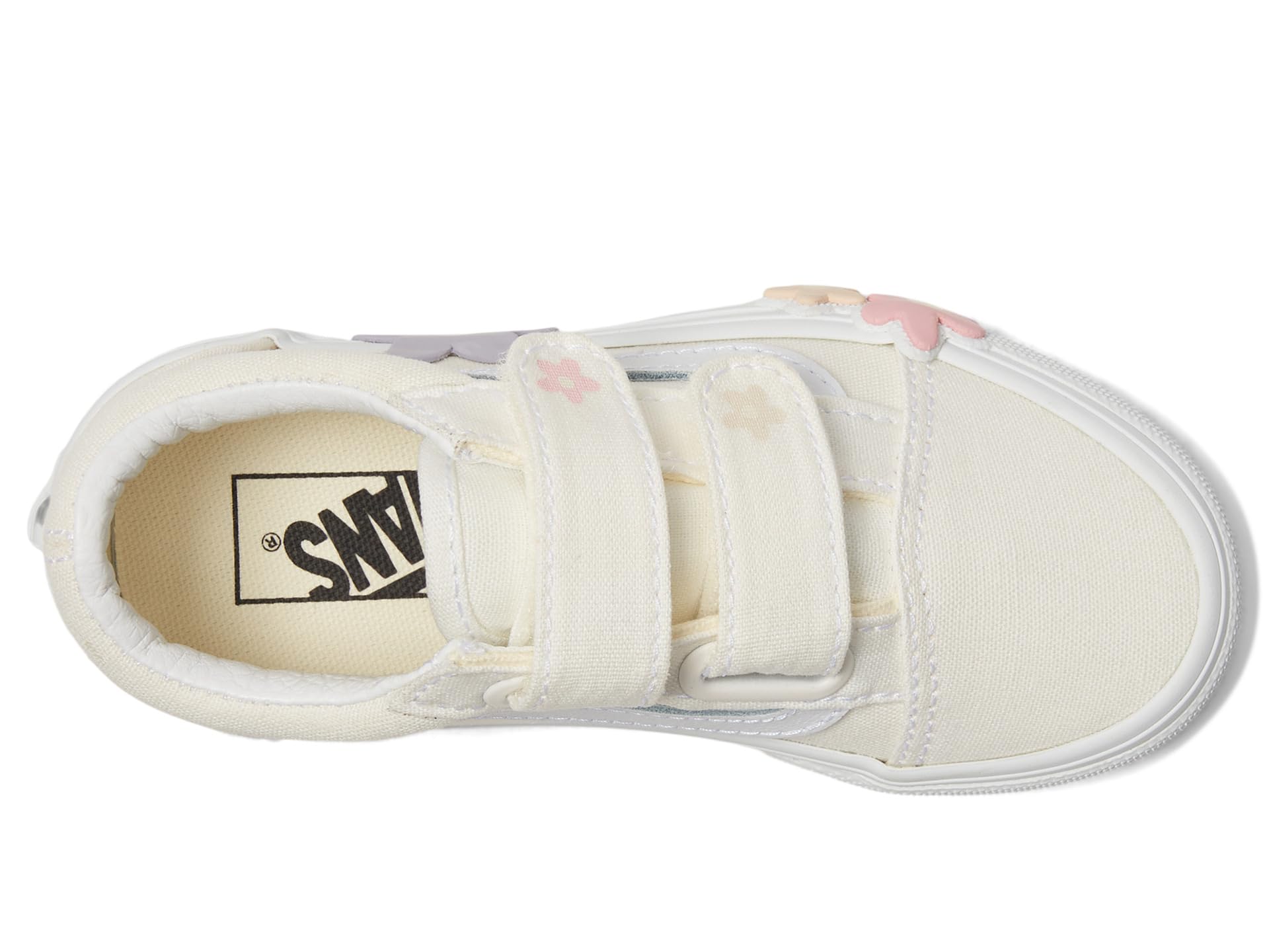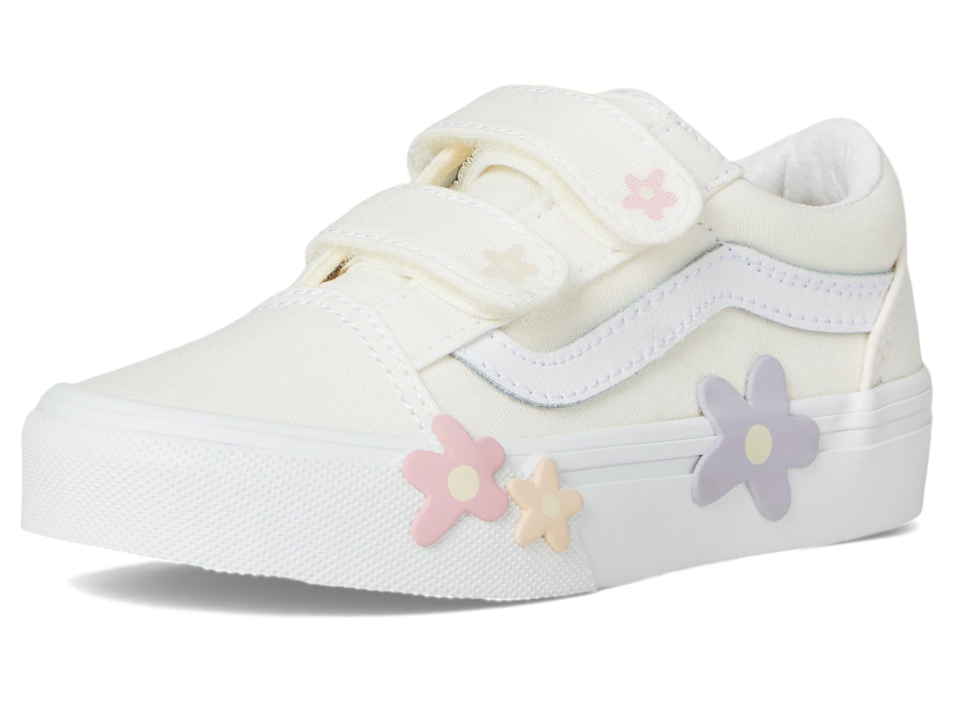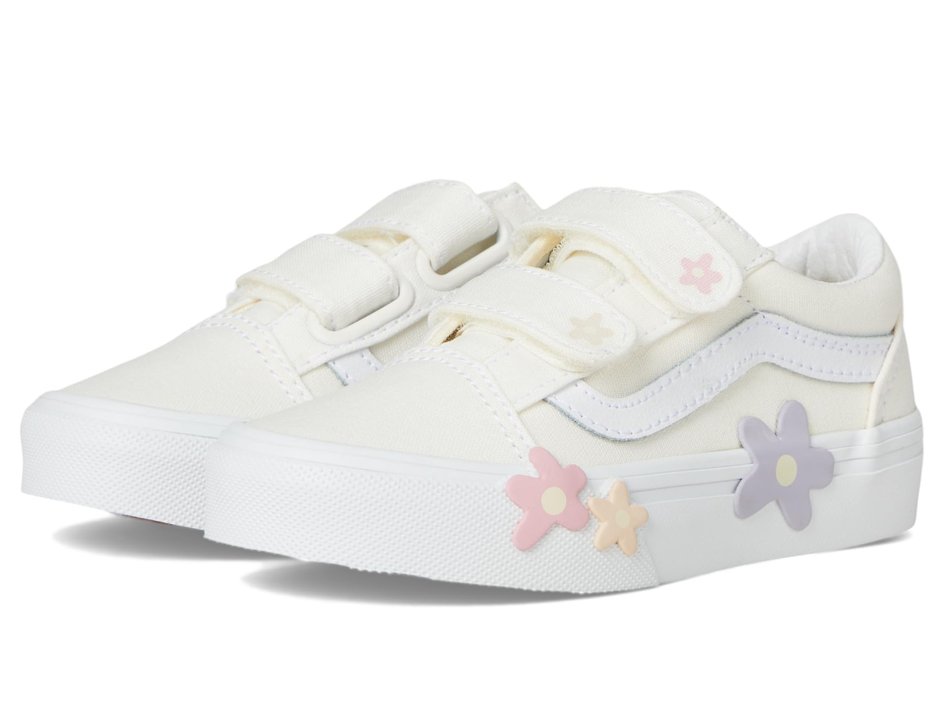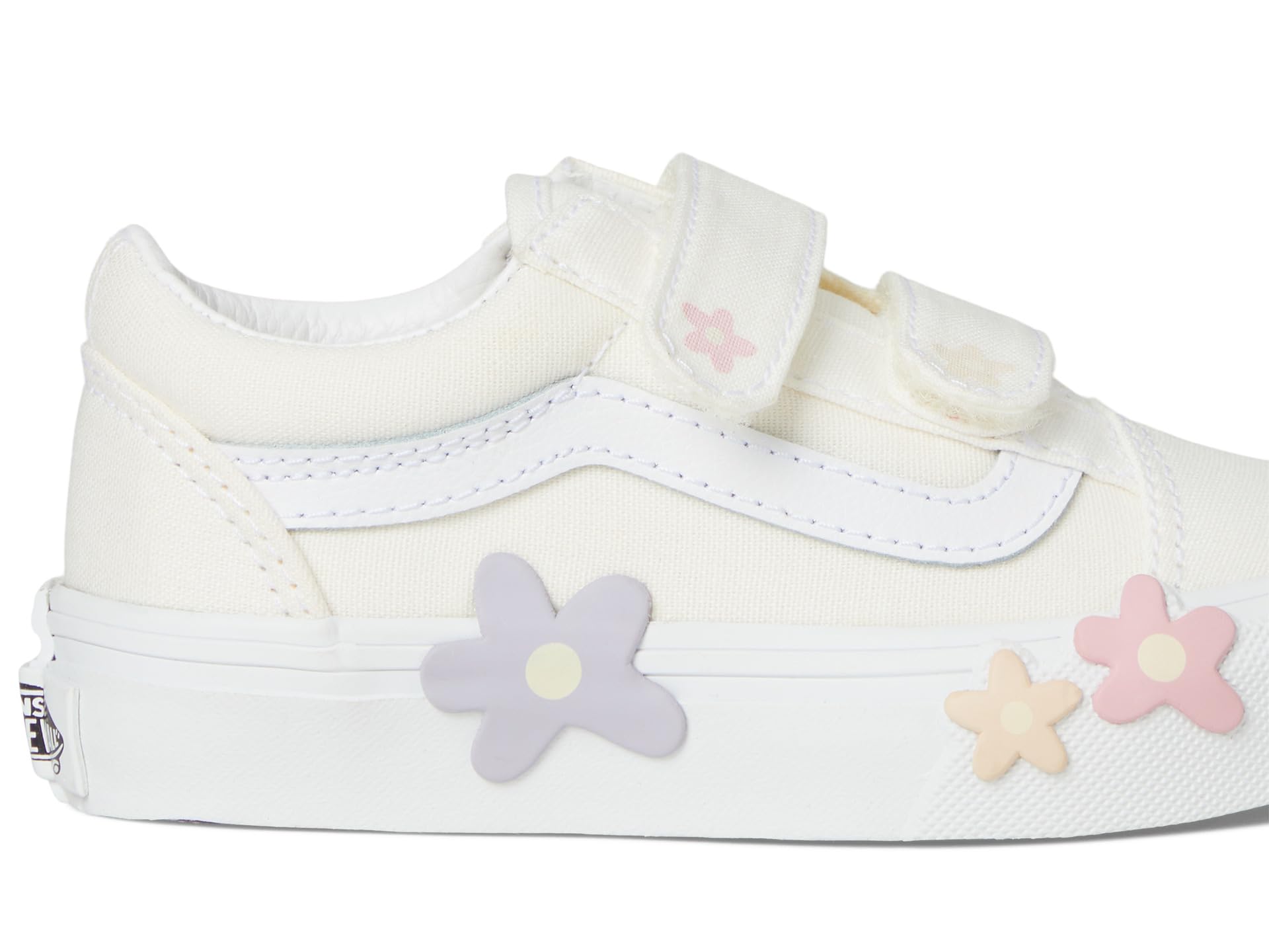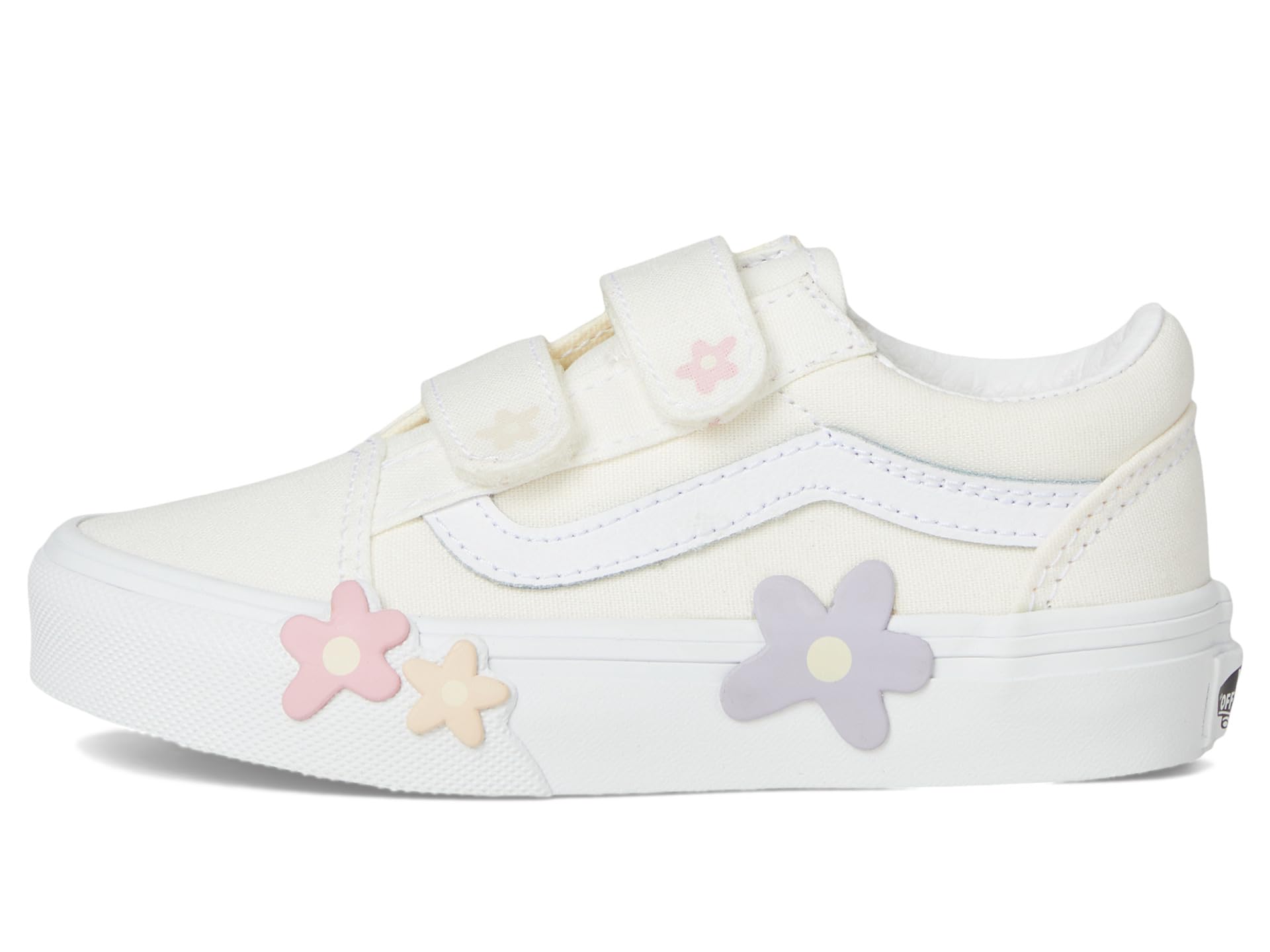 - With its iconic low-top design and beautiful flower motifs, the Vans® Kids Old Skool V Flower Shoes add a beautiful detail to your look. The round-toe shoes are crafted with a canvas upper with the Vans® iconic side stripe detail, cotton lining, and comfortable rubber insole. The reinforced toe cap and double hook-and-loop closures ensure the perfect fit.
