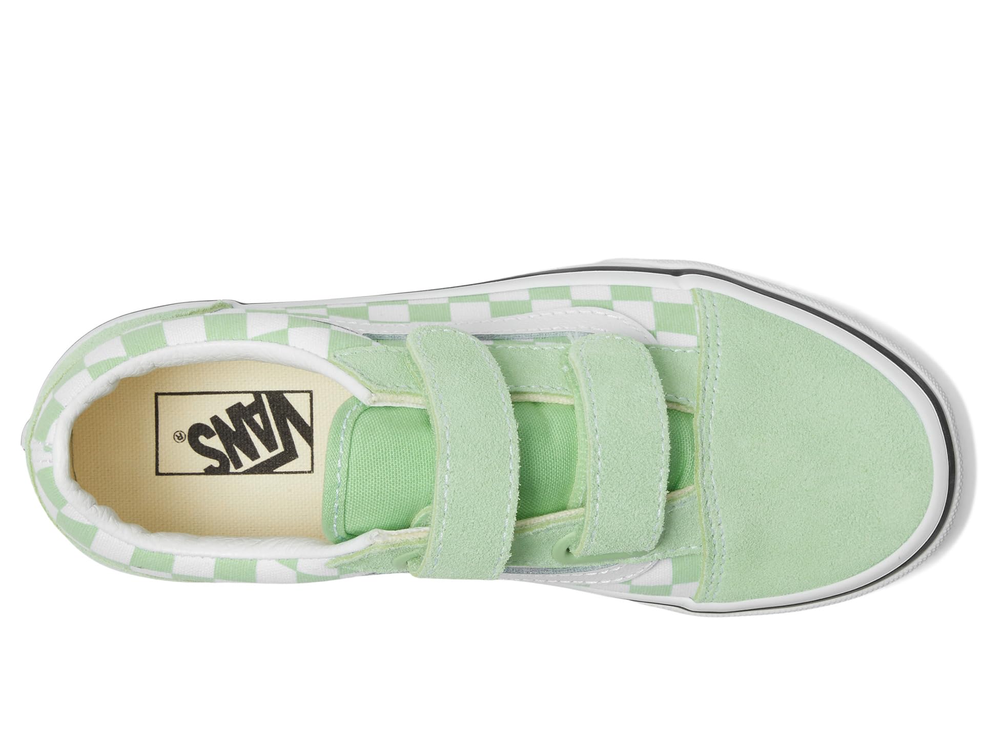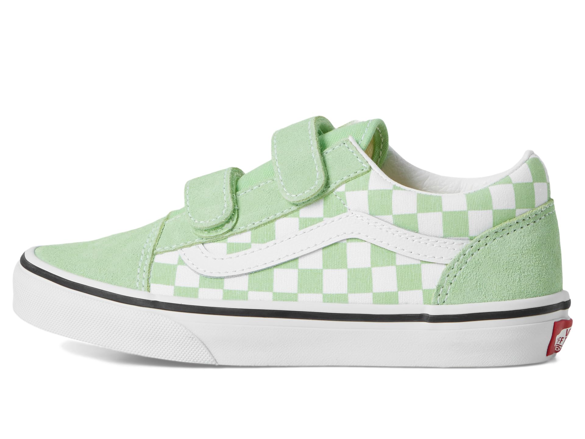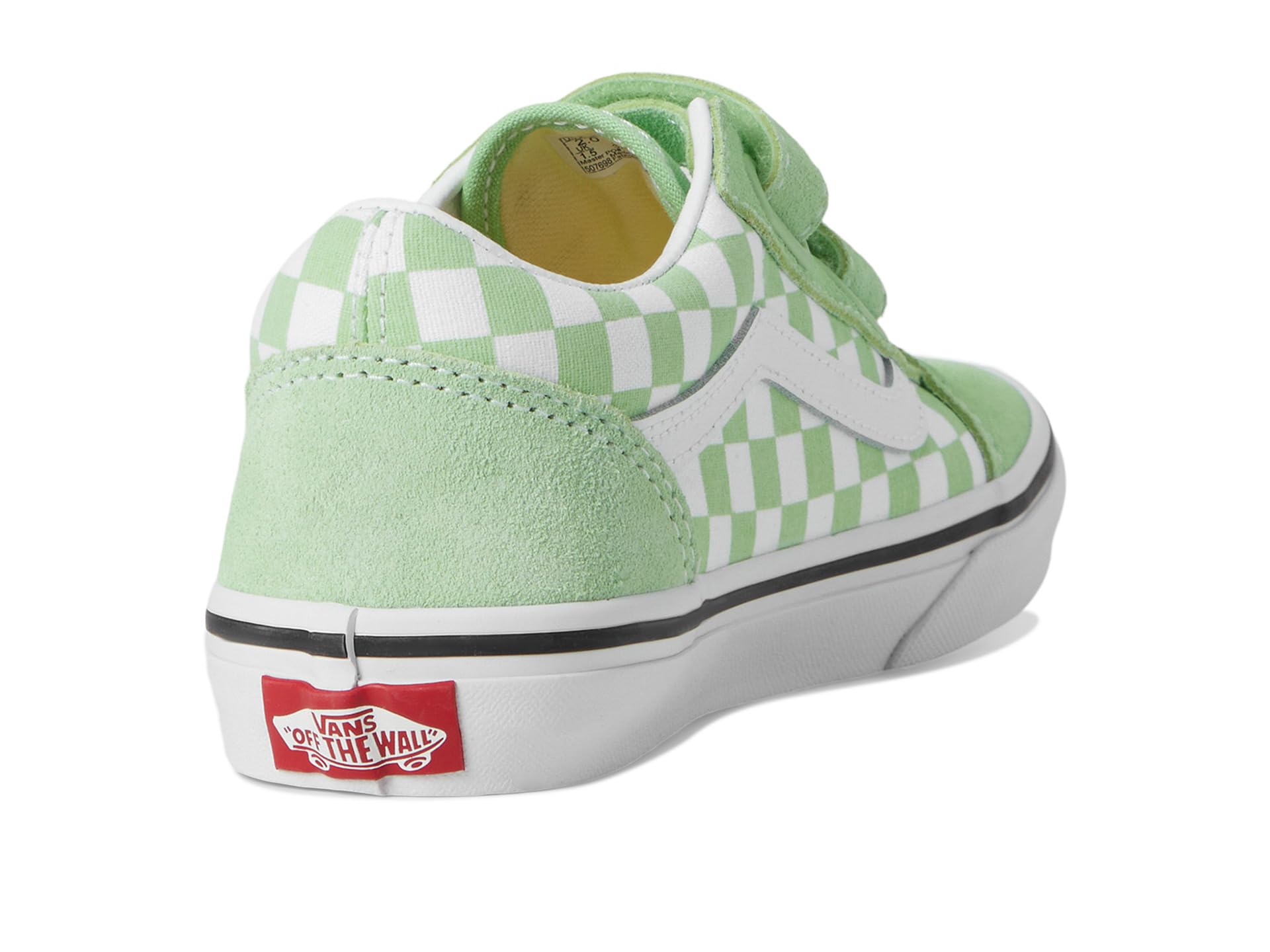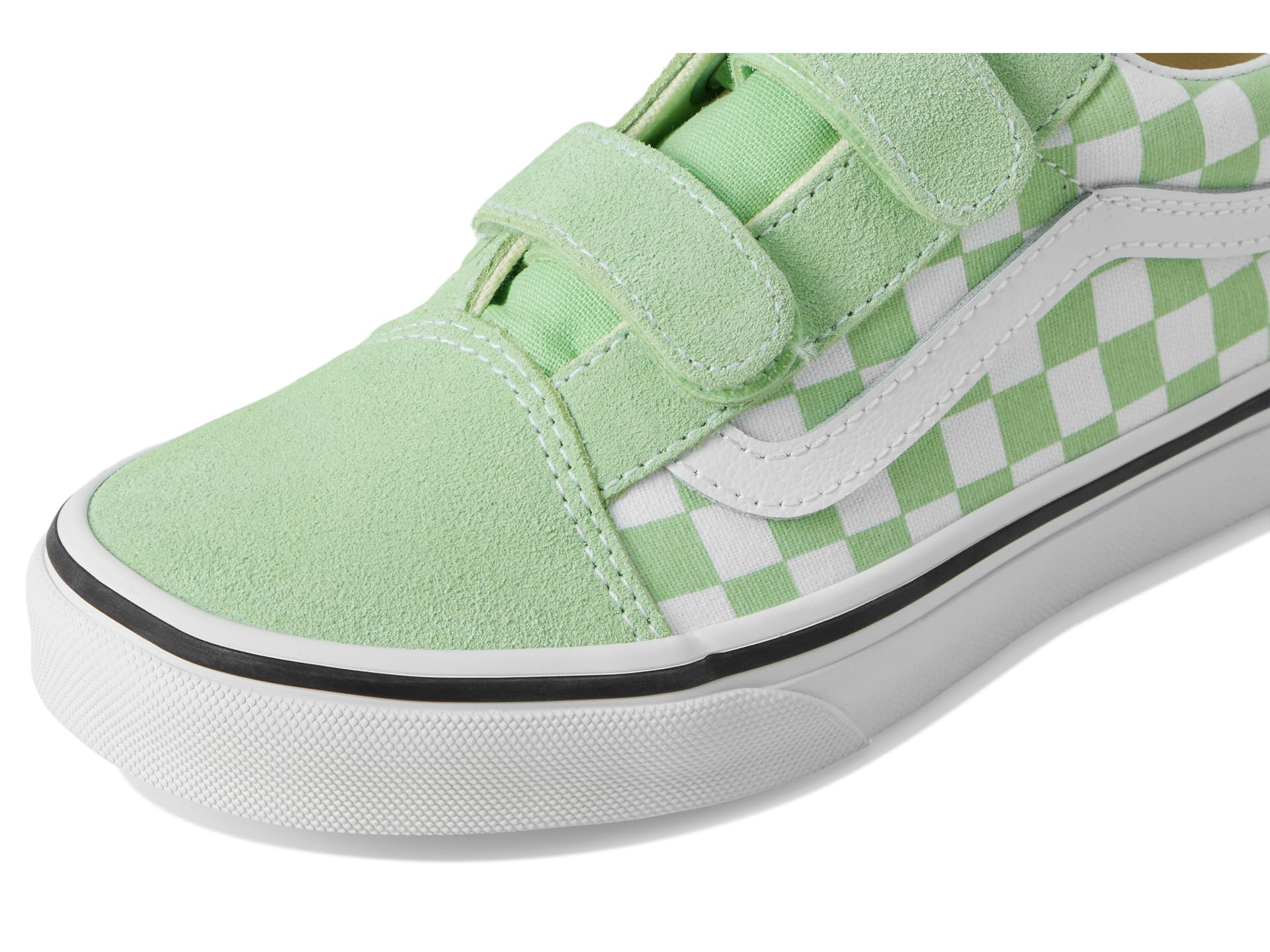 - The Vans® Kids Old Skool V sneakers are iconic low-top, Sidestripe shoes that are made of a canvas upper with glitter detail for an eye-catching appeal. Their dual hook-and-loop straps ensure a secure fit. These glitter shoes are made of a rubber insole and cotton lining for all-day comfort. Match your kid’s outfits and styles with these low-top shoes.
