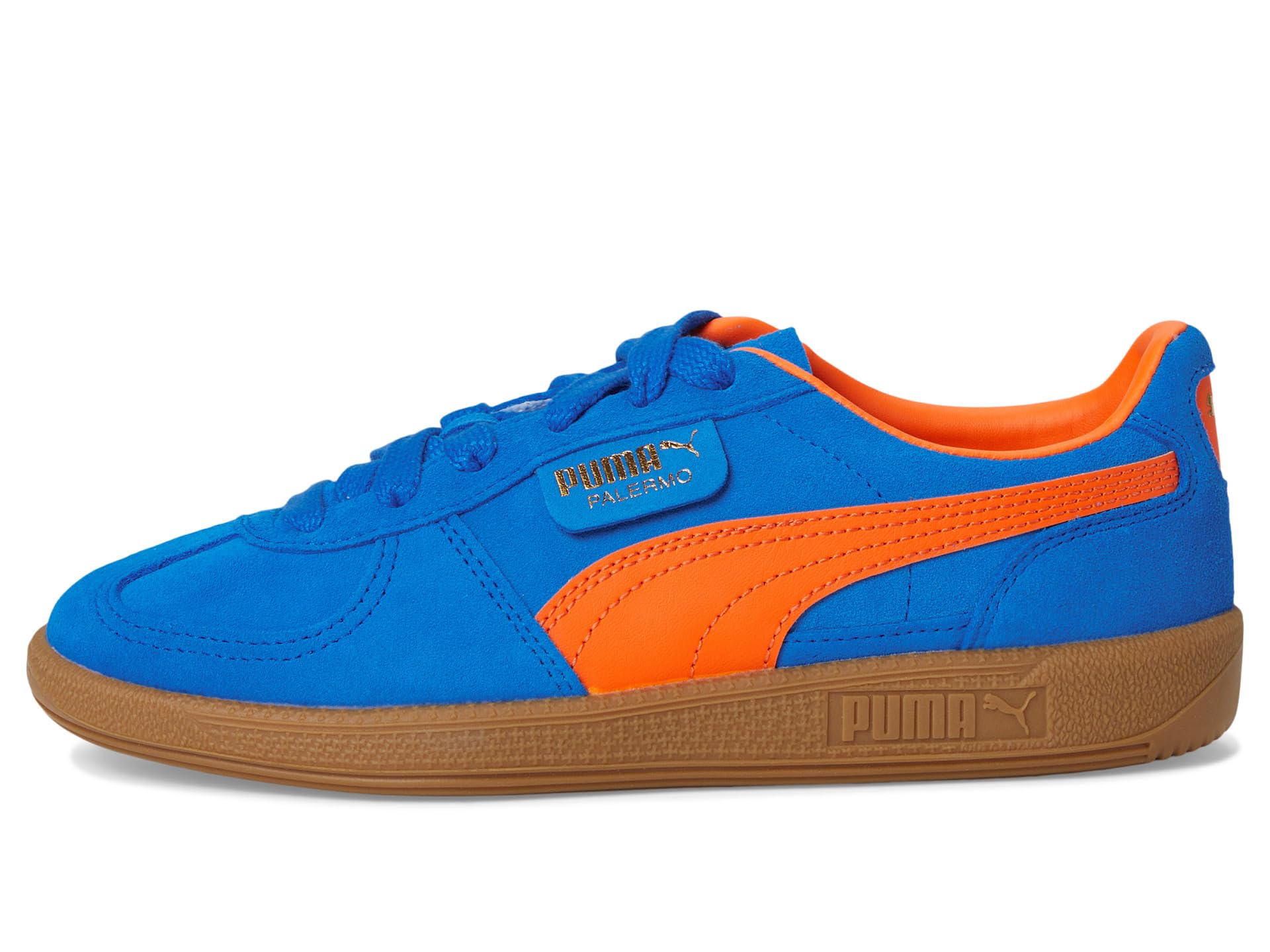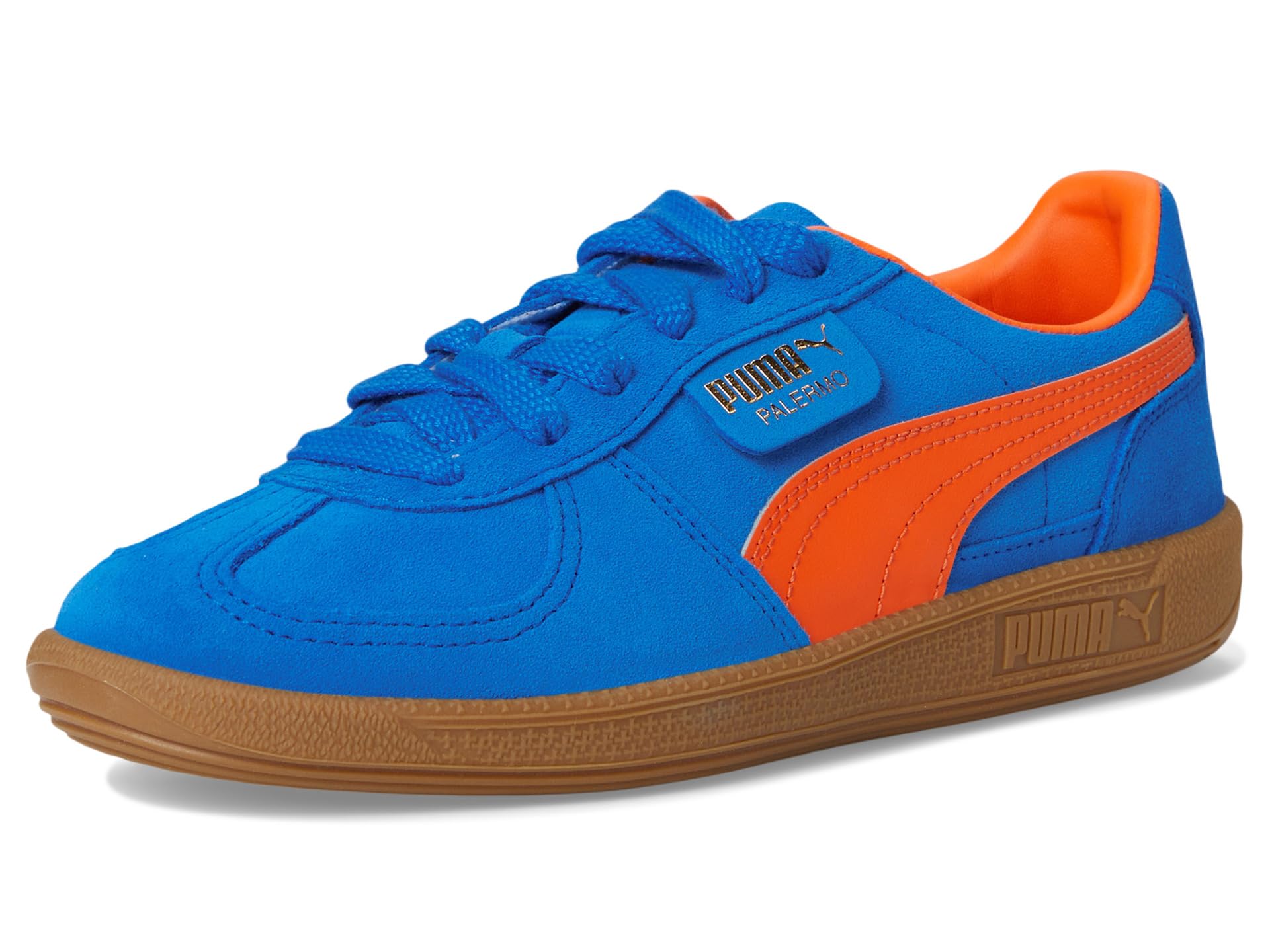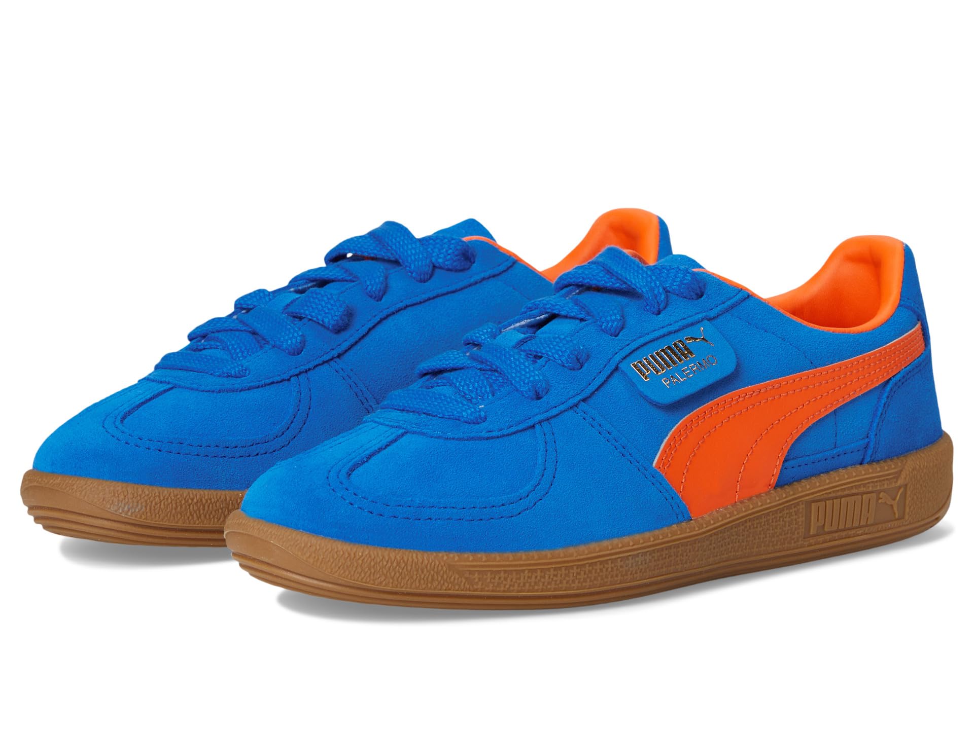 - Let your little one step into the groove wearing the PUMA® Kids Palermo. Crafted from plush suede and leather upper, this pair of funky shoes features debossed and foil-printed Puma branding on quarter panel tab and heel cap, while the T-toe construction nods back. Featuring a lightweight tongue and padded collar for a comfy fit, it comes with a cushioned midsole and rubber insole. Finished off with the eye-catching Formstrip to the sidewalls, the Cat window at the heel and the PUMA tag by the laces.
