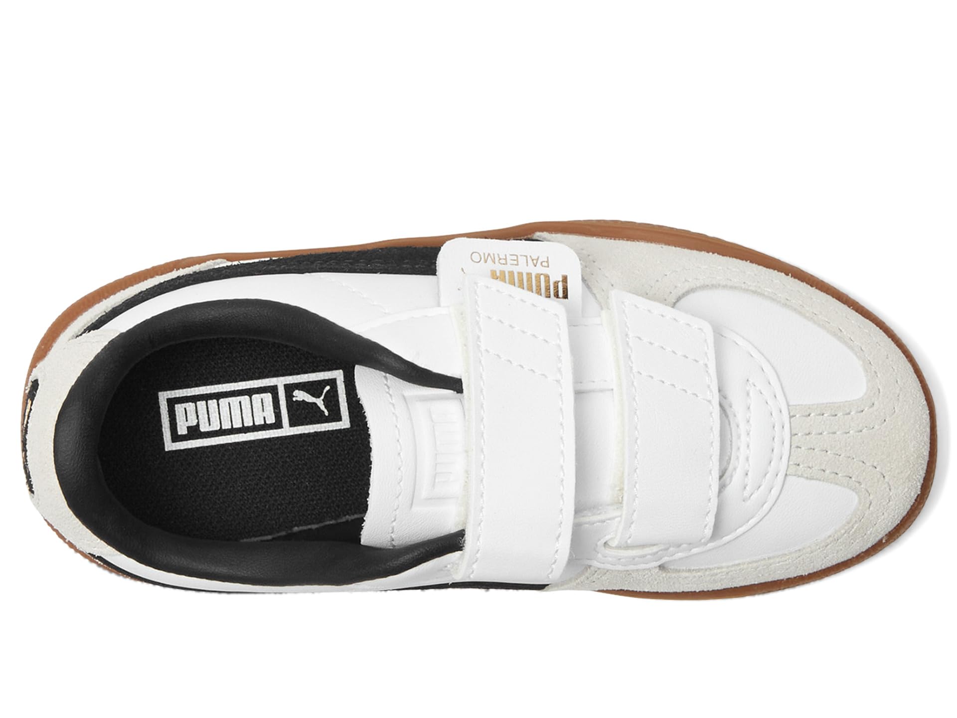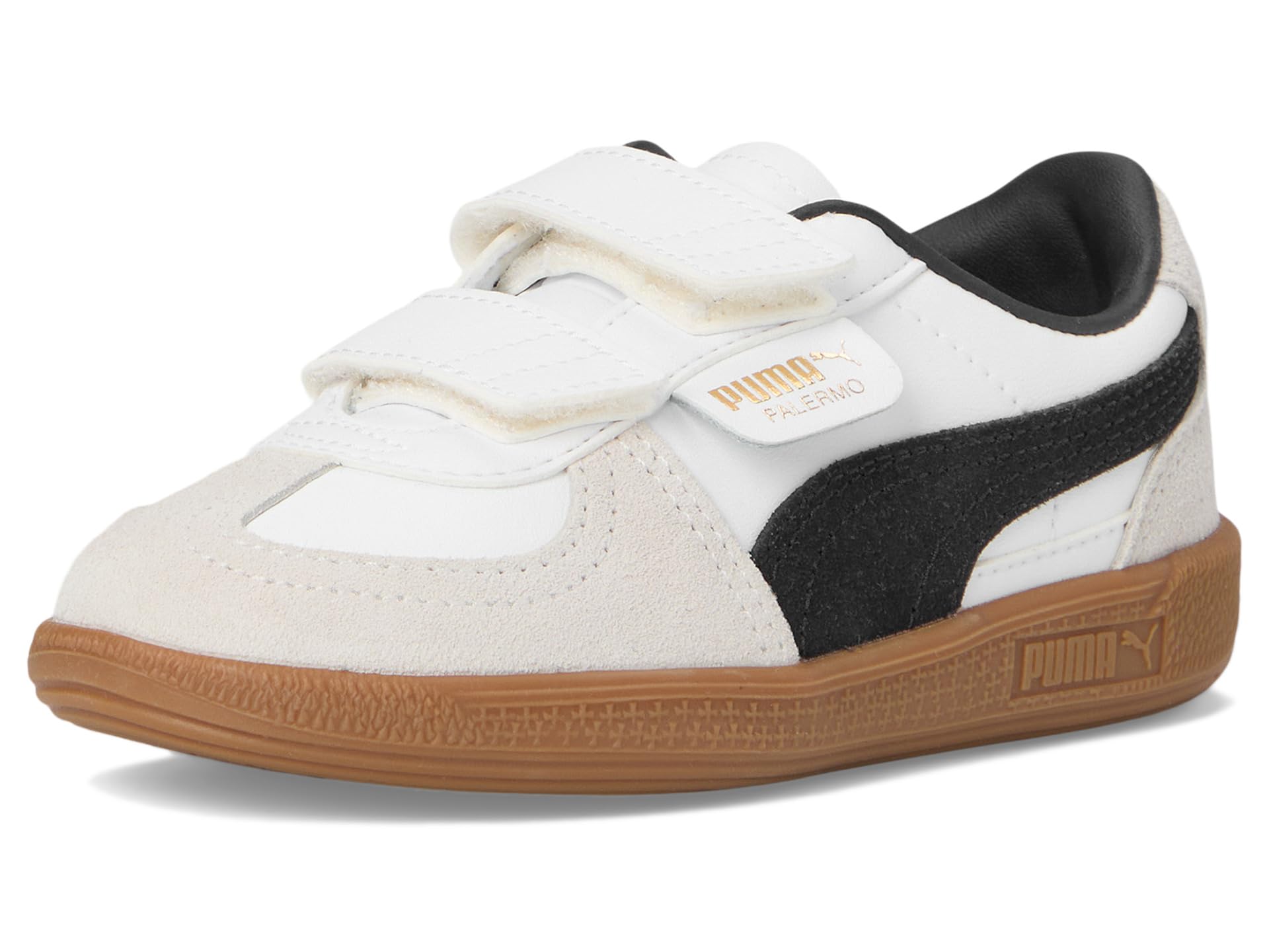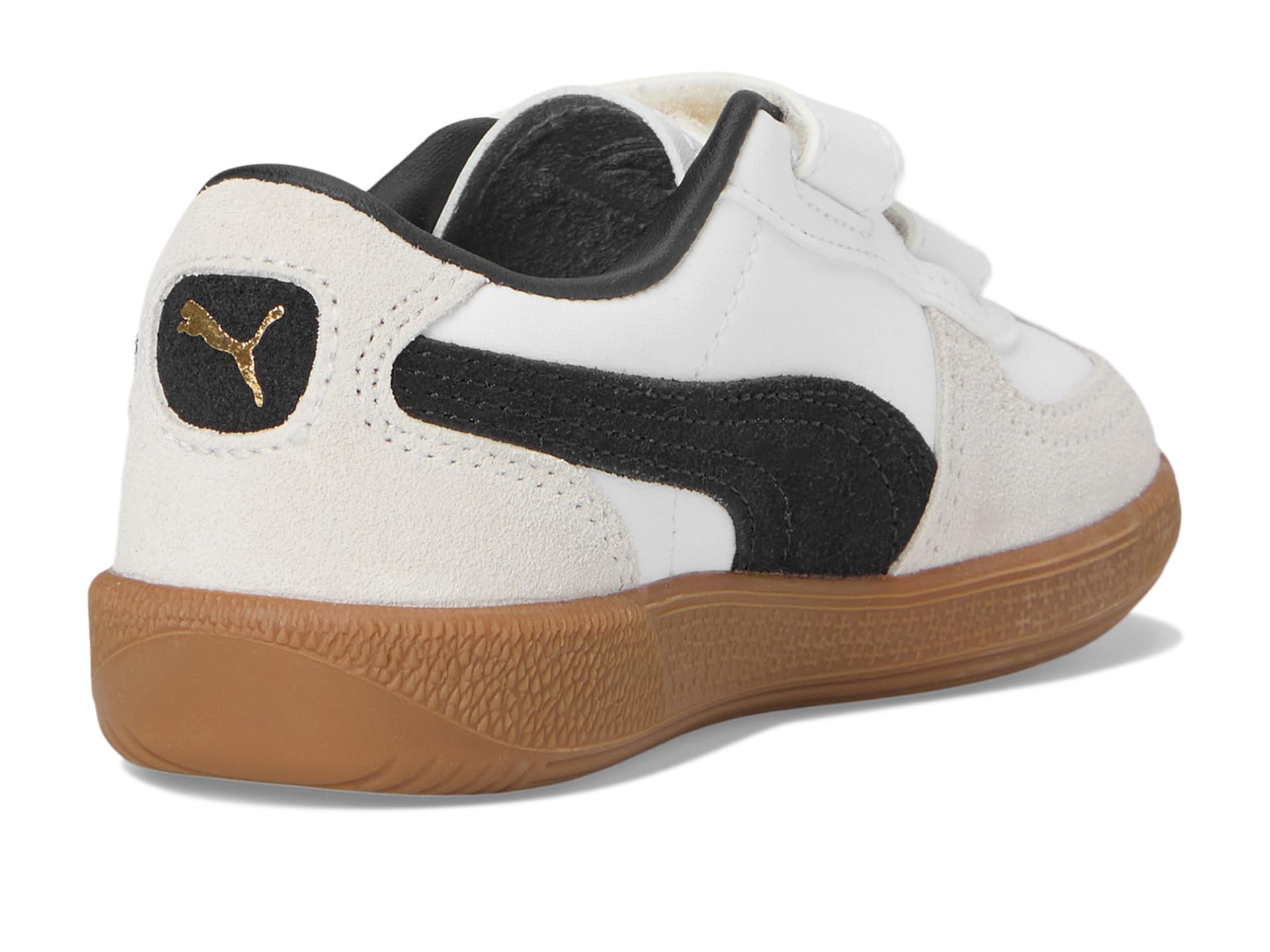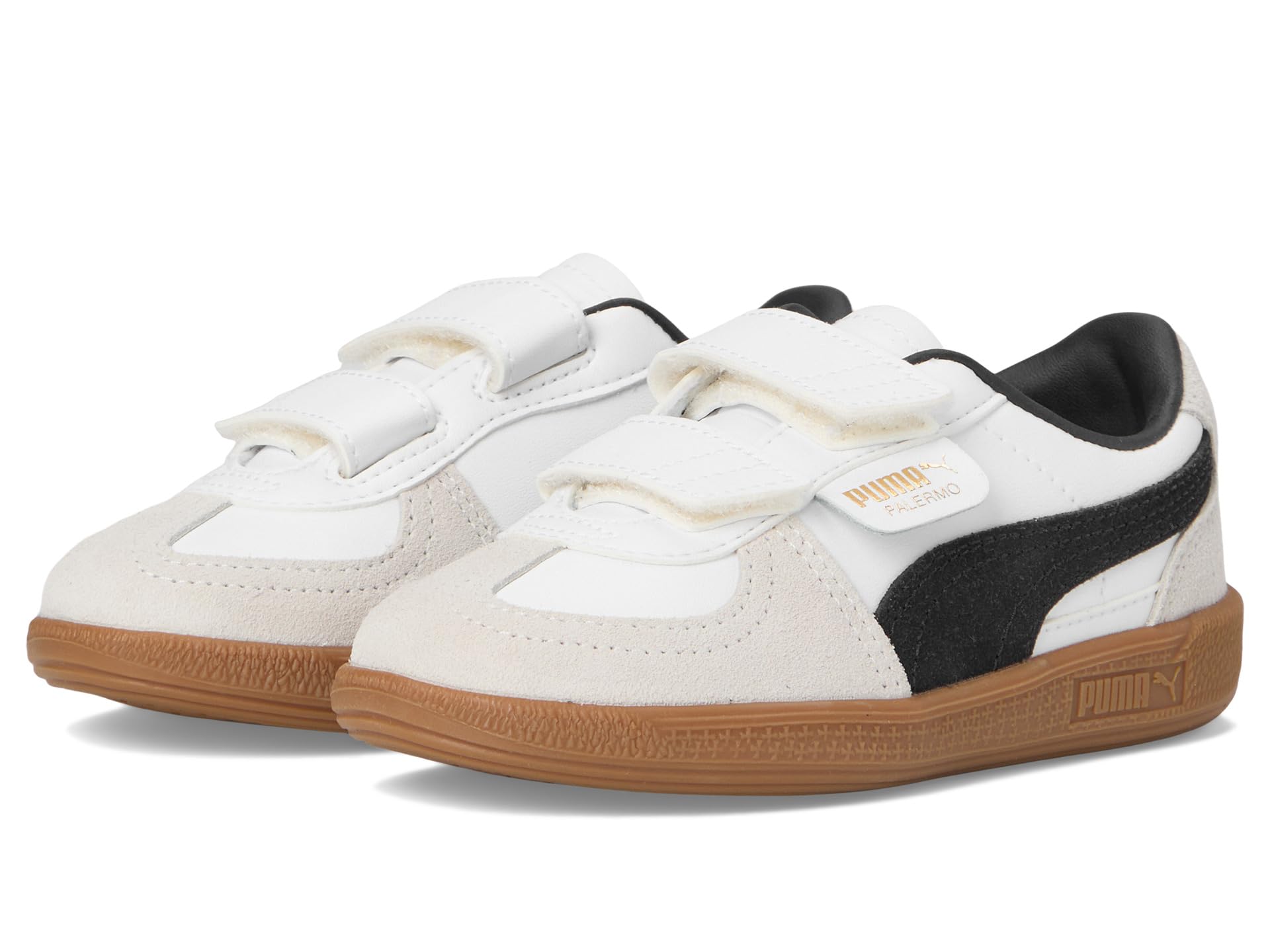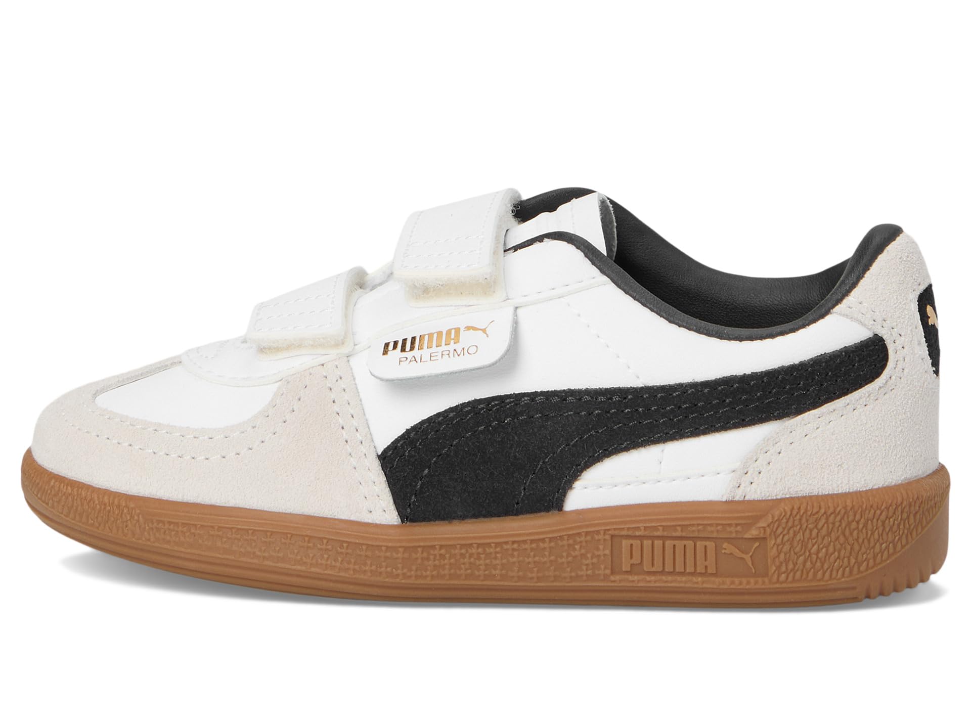 - Bring a terrace legend to your little one’s wardrobe sporting the PUMA® Palermo, a nod to the iconic ’80s design that ruled British football stadiums. This heritage silhouette features a sleek leather upper paired with a T-toe construction for timeless appeal. The gum sole adds classic charm, while the polyester lining and durable rubber outsole ensure all-day comfort. The hook-and-loop closure offers easy on-and-off convenience, perfect for busy kids on the go. Whether for play or casual outings, these eye-catching kicks combine retro flair with modern functionality, keeping young trendsetters comfortably stylish every step of the way.