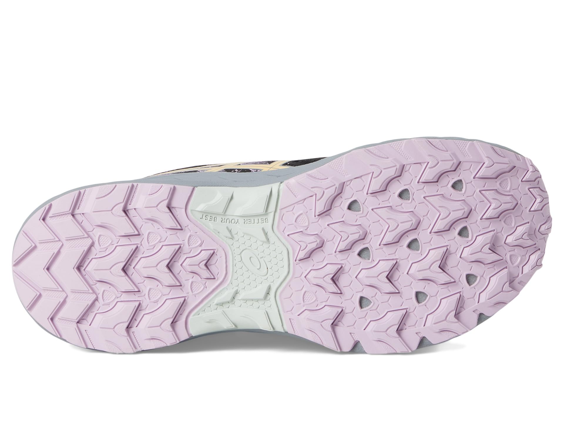 - Trail-specific rubber outsole patterns improves grip on various surfaces.