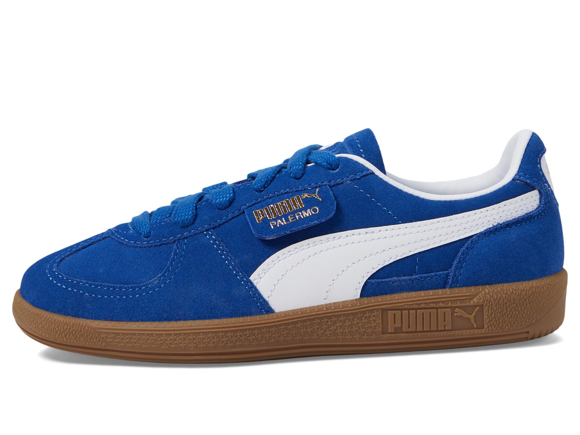- Let your little one step into the groove wearing the PUMA® Kids Palermo. Crafted from plush suede and leather upper, this pair of funky shoes features debossed and foil-printed Puma branding on quarter panel tab and heel cap, while the T-toe construction nods back. Featuring a lightweight tongue and padded collar for a comfy fit, it comes with a cushioned midsole. Finished off with the eye-catching Formstrip to the sidewalls, the Cat window at the heel and the PUMA tag by the laces.